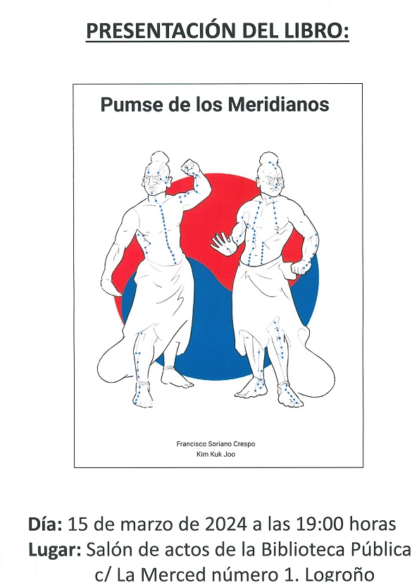 Llevar a cabo la presentación del libro "Pumse de los Meridianos", que persigue, a través de la filosofía de la medicina oriental y de los movimientos del taekwondo, movilizar la energía de nuestro cuerpo para la mejora de nuestra salud. Tras la presentación se llevará a cabo una pequeña charla sobre la energía de la alimentación, ampliando así el capítulo del libro que trata esta materia superficialmente.